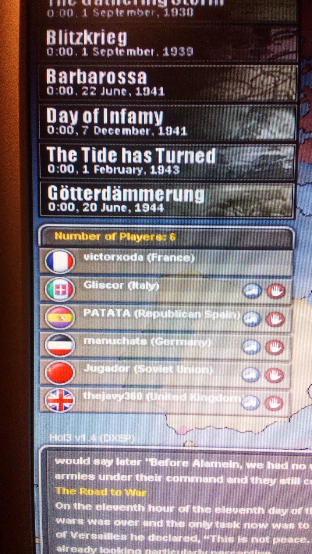 El resto se conectan a él dándole a multijugador>conectarse a internet e introduciendo la ip del host, que a él le aparece arriba de su nombre en la pantalla del hamachi. Cuando esten todos cada uno que elija su país, el host empieza una nueva partida u otra empezada y ¡a jugar!