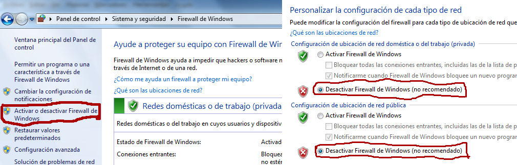Nos vamos al menú de windows>panel de control y sistema y seguridad, arriba a la izquierda. A continuación presionamos en "Firewall de Windows" y nos vamos a "Activar o Desactivar Firewall de Windows" y desactivamos el firewall de Windows en la red doméstica y pública (Para que no haya ningun problema). Ya tendriamos abiertos los accesos y estamos listos para jugar en ese aspecto.